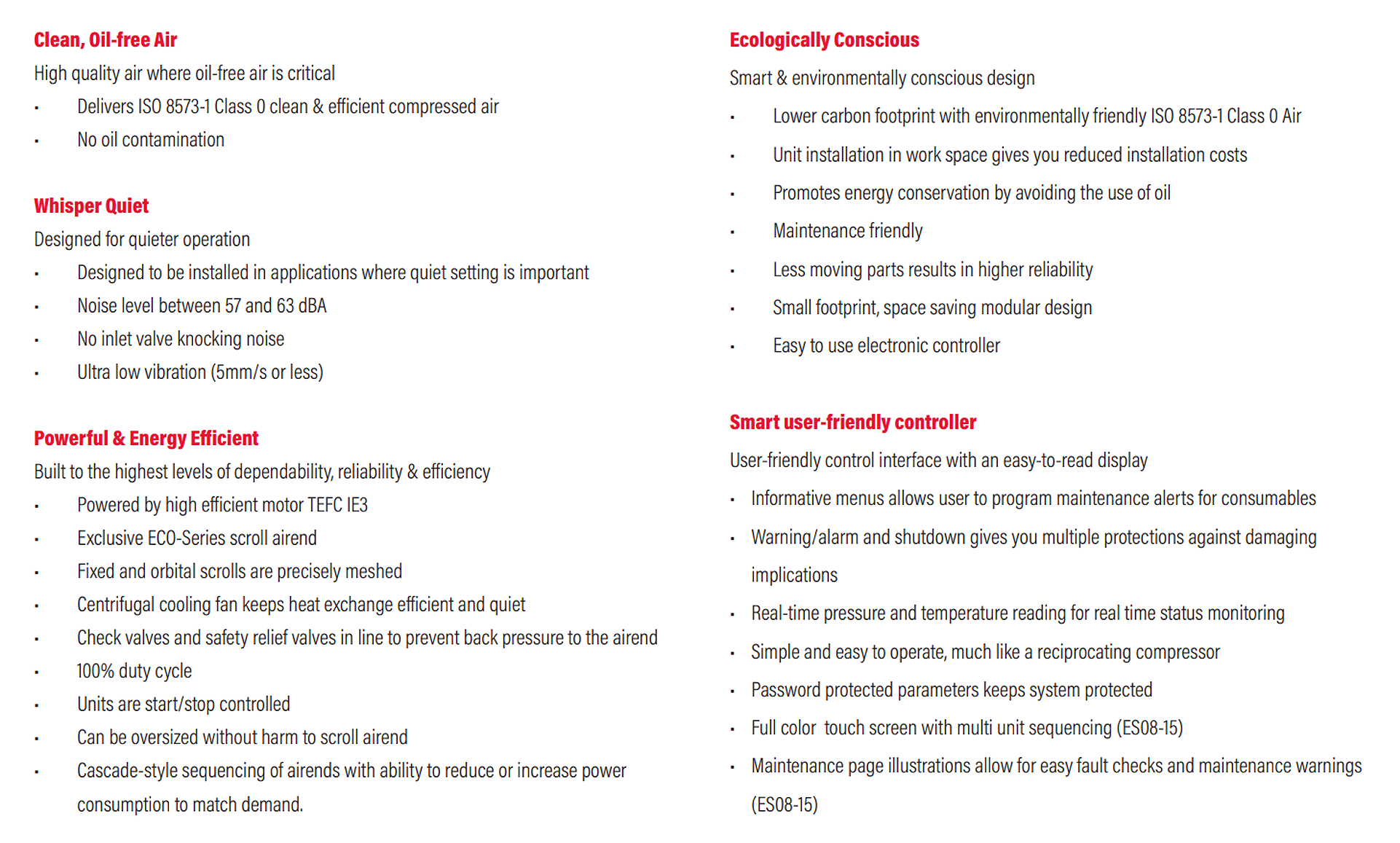 ES Series Eco-Scroll Fixed Speed Working Pressure : 8.0 Bar g (116 PSI) Air Delivery : 0.41 – 1.6 m3/min (15 – 57 CFM) Motor Power : 4 – 15 KW (5.5 – 20 HP)