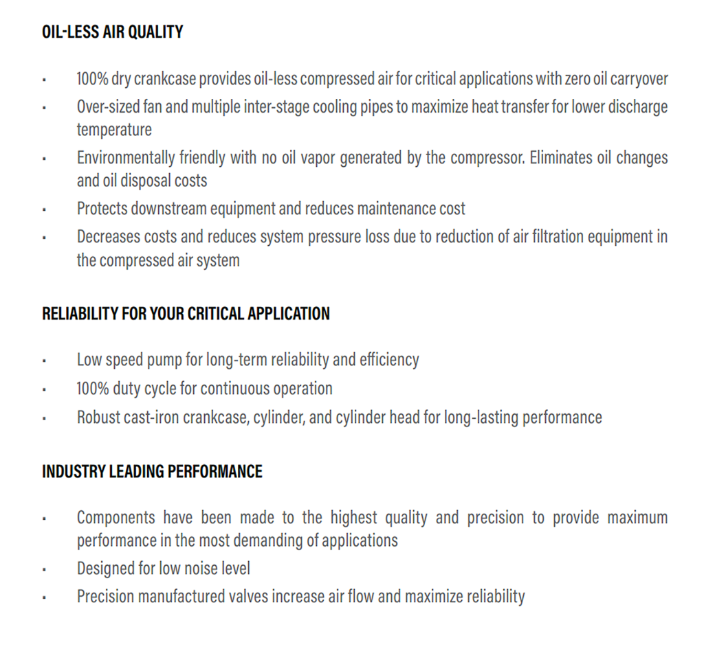 OL Series is the ideal reciprocating oil-less air compressor for applications where critical air quality is required such as food and beverage, medical, chemical processing, pharmaceutical, electronics, and more.The 100% dry crankcase provides oil-less compressed air for critical applications with zero oil carryover. It’s environmentally friendly with no oil vapor generated by the compressor, which eliminates the need for oil changes and oil disposal costs. The low speed pump and robust cast-iron crankcase, cylinder, and cylinder head ensures that the OL will offer long-term reliability and long-lasting performance.
